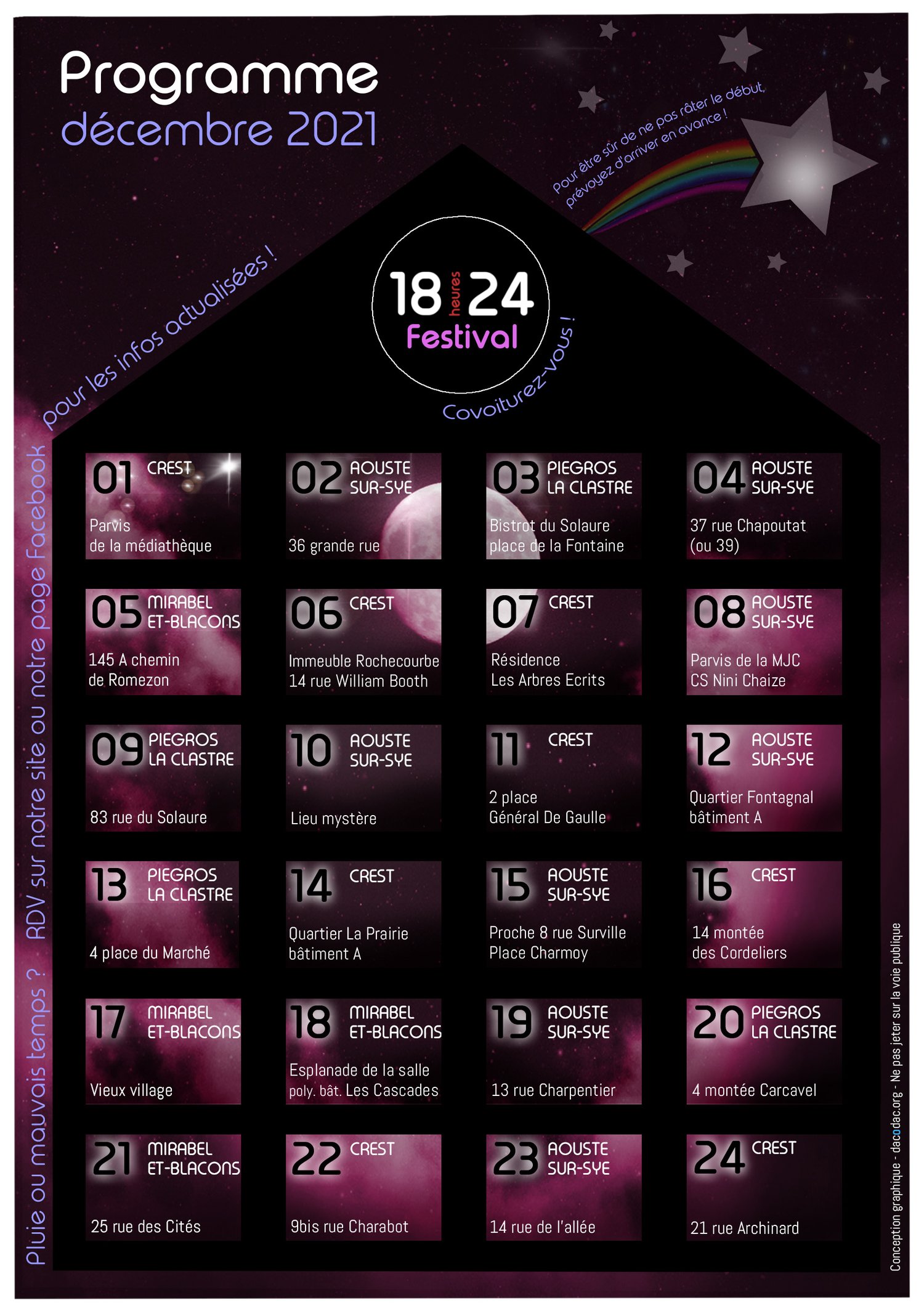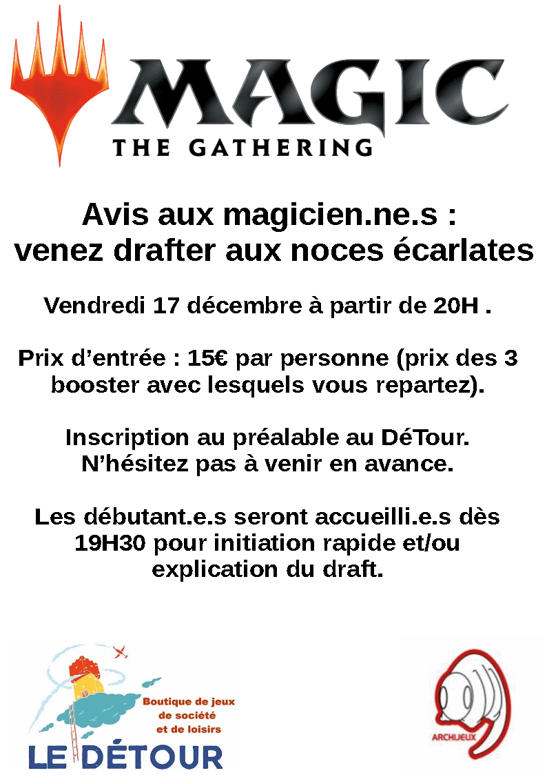 | The mysterious K – Escape game Savez-vous ce qui se trame au sous-sol d’Archijeux ? Avez-vous aperçu les couleurs chatoyantes de la cage d’escalier qui mène au niveau -1 ? Avez-vous déjà eu le courage de descendre pour percer le mystère du K ? Si vous n’avez pas encore tenté l’aventure, constituez une équipe de choc et inscrivez-vous vite pour vivre cette étonnante aventure. Jusqu’à fin décembre, profitez de notre offre de lancement : 70€/équipe ou 50€/équipe en tarif réduit !   Cliquez ici pour vous inscrire à une session d’Escape Game 18H24, le calendrier de l’avent vivant, C’EST PARTI !!!! Chaque soir, à 18h24, une courte forme artistique est jouée depuis 1, 2, 3… fenêtres et regardée depuis l’espace public. Des propositions variées dans le domaine du spectacle vivant : musique, danse, théâtre, marionnettes, cirque, vidéo, projection, etc… 18h24 Festival est un projet qui réunit différentes compagnies et structures associatives, sociales et culturelles du département de la Drôme, projet qui sera joué à : Aouste sur Sye, Crest, Mirabel et Blacons et Piégros la Clastre.   Ne rater aucune information ! Nouvelle ouverture les lundis soir ! Si vous avez froid en sortant de l’école et que vous avez envie de partager un moment de jeu avec votre/vos enfant(s), venez jouer à Archijeux, de 16h45 à 18h15 un lundi sur 2. Vous pouvez venir même sans mioche ! Les prochaines dates sont les 6/12, 20/12, 03/01, 17/01 & 31/01 Et si l’idée vous plait, et que vous avez du temps, vous pouvez proposer les ouvertures complémentaires les 2 autres lundis du mois. Soirée Nouvex jeux du Détour : jeudi 9 decembre à 20h00 Venez découvrir les nouveautés reçues tout récemment en démo au magasin le Détour et mises à disposition à Archijeux ! Article complet ici Soirée Blind Test : samedi 11 decembre à 20h30 Vous êtes le sosie de Michel Polnareff ? Votre pommeau de douche est votre meilleur public ? Vous connaissez toute la discographie de Georges Brassens et des Daft Punk ? Cette soirée est faite pour vous !   Cours de Salsa : dimanche 12 décembre de 15h à 16h30 Venez danser la salsa avec Cédric le dimanche après-midi. Cours gratuits tous niveaux, grand.e.s débutant.e.s accepté.e.s, même celleux qui marchent sur les pieds !   Prochain Conseil d’Administration : mercredi 15 décembre à 20h Les membres du CA et les salariés se retrouvent une fois par mois pour faire un point sur les différentes commissions et échanger sur les différents projets en cours. Ces réunions sont ouvertes à tous : vous êtes les bienvenus ! Prévenez-nous de votre venue, afin que nous puissions vous offrir le meilleur accueil… Inscription par mail à association@archijeux.org Espace de Vie Sociale Archijeux est reconnu Espace de Vie Sociale depuis mai 2019. En effet, l’association a à cœur de faire partie de l’animation de la vie sociale sur le territoire et de valoriser le café-jeu comme espace d’échange et de lien. Cette année, nous renouvellons ce projet et nous le présentons à la CAF de la Drôme le jeudi 16 Décembre à 10h30. N’hésitez pas à venir assister à cette restitution et en apprendre plus sur les actions sociales d’Archijeux.  Soirée Tournoi de Coinche : jeudi 16 décembre Soirée à ne pas manquer ! Ambiance archidesque garantie ! écrivez-nous pour plus d’informations Soirée MAGIC – Vendredi 17 décembre à partir de 19h30   Infos et inscriptions au Détour Soirée Dominion : jeudi 23 décembre à 20h00 Venez découvrir le jeu qui a inventé la mécanique du deck building et 3 de ses nombreuses extensions, présente des manière exceptionnelle ce soir là à Archjijeux. Ce soir sera accessoirement l’anniversaire de l’animateur, qui a choisi de proposer ce jeu car c’est un de ses préférés, et pour vous motiver à venir le découvrir, il offre 1 part de gâteau à tous ceux qui viendront faire au moins 1 partie de Dominion ce soir là ! Article complet ici     Jeudi 30 décembre A partir de 18h : Soirée spécial Stella Vennez tester Stella, le nouveau jeu Dixit ! Vennez faire des étincelles enssemble sur cette nouvelle version du jeu. Il y a des nouvelles règles et du nouveau matériel, mais les cartes sont les mêmes et les deux jeux sont compatibles, permettant ainsi de diversifier les parties. info complète ici  A partire de 21h : Soirée gros jeu surprise Ouverture Normale du Lieu, mais l’ouvreur apportera 1 jeu expert qu’Archijeux ne propose pas habituellement. Il ne sait pas encore lequel – ça dépendra peut-être de Noël 😉 -mais ça laisse la surprise, c’est plus drôle comme ça ! Archijeux recrute… ENCORE !!!! L’association a du succès et de plus en plus de demandes d’animation, de prestation, de création de jeux… Sans compter l’ouverture de l’Escape Game ainsi que prochainement l’espace Ados à la cave. Donc si le projet associatif et le lieu te plaisent, que tu as envie de t’y investir et de rejoindre l’équipe salariée, n’hésites-pas à aller voir la fiche de poste et à candidater 😉 Au plaisir de te rencontrer. La fiche de poste est ici Fiche de poste  Archijeux sera ouvert le soir de Noël, le 24 Décembre ainsi que le 31 Décembre pour le réveillon. Venez partager un repas avec nous et jouer jusqu’au bout de la nuit ! Pour le réveillon, des mocktails (cocktails sans alcool) vous seront offert ! Et évidement, Nuit du Jeu ! Article ici. |