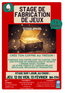 Ce projet est rendu possible grâce à la CAF de la Drôme, dans le cadre du projet « Partager consommer autrement ». Dans ce cadre, nous proposons toute une série d’ateliers « do it yourself » de fabrication de jeux et jouets à partir de matériaux de récupération, à Archijeux ou dans des structures partenaires (PMI, MJC, Centre sociaux…)